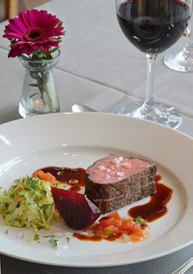 När gästerna intagit den vackert dukade och smyckade matsalen i Slottsmagasinet avnjutes en 3-rätters bröllopsmeny med passande viner. Bröllopstårta och vickning serveras i Magasinet där dansen kan pågå långt in på småtimmarna.